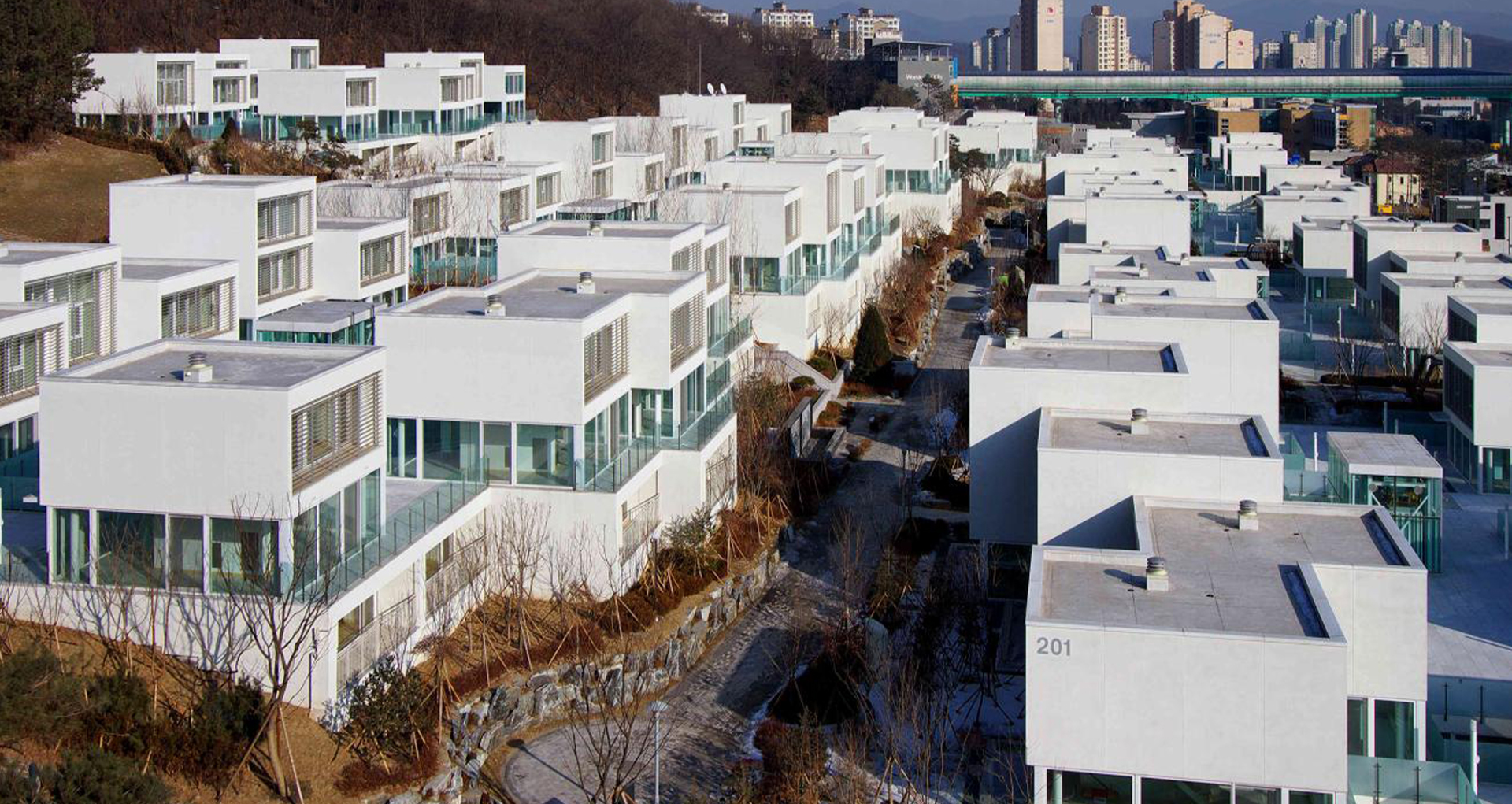 Larger housing projects also embody relational elements, assuring that even residents who live alone don’t dwell in isolation. Pangyo Housing (Seongnam, Republic of Korea 2010), a complex of nine low-rise housing blocks is designed with nonprescriptive transparent ground floor volumes that catalyze interconnectedness between neighbors. A communal deck across the second floor encourages interaction, featuring spaces for gathering, playgrounds, gardens and bridges that connect one housing block to another.
